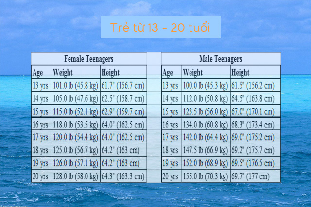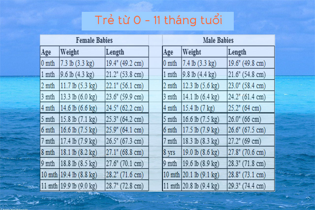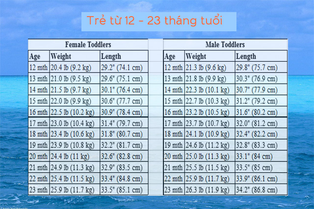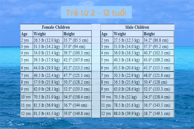 Theo WHO, Cân nặng chiều cao chuẩn cho trẻ theo từng độ tuổi được tính theo bảng sau: