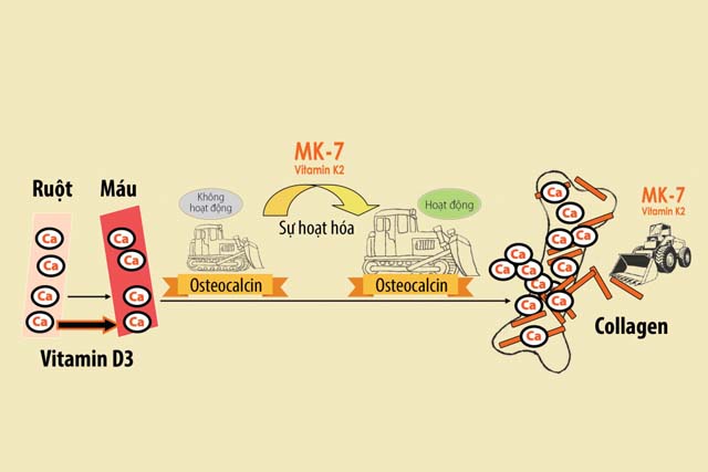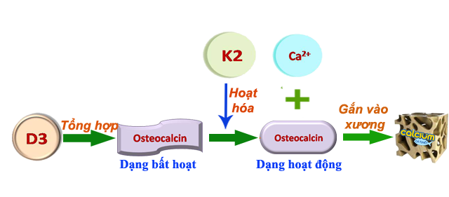 Vitamin K2 có vai trò hoạt hoá protein MGP, giúp MGP chuyển từ dạng bất hoạt (ucMGP) sang dạng hoạt động (cMGP). Ở trạng thái hoạt động (cMGP), protein này gắn với ion Ca trong máu, ngăn không cho chúng lắng đọng xuống thành mạch. Ngoài ra, K2 còn kích hoạt protein osteocalcin, giúp gắn ion canxi vào khung xương hình thành mật độ xương, ngăn ngừa loãng xương.