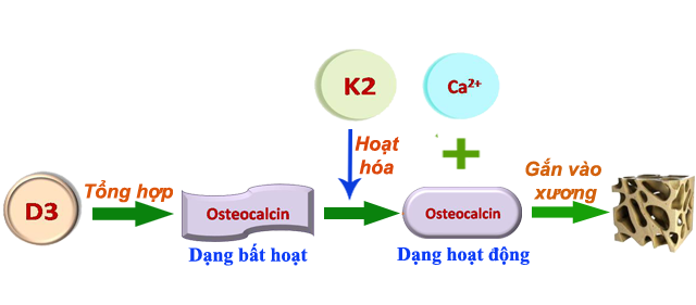 Protein này được kích thích sản sinh nhờ vitamin D3 nhưng khi không có K2, Osteocalcin sẽ không gắn được ion canxi vào xương. Vì thế, nếu thiếu vitamin K2 thì bạn có bổ sung bao nhiêu canxi cũng sẽ là vô nghĩa.